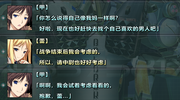 8.1,三人参加战斗,结束后蕾突然开着机甲冲进来,说的是“请和我交往”,结果甲听成了“互刺”,二人大战一场。晚上甲和真互诉衷肠:?